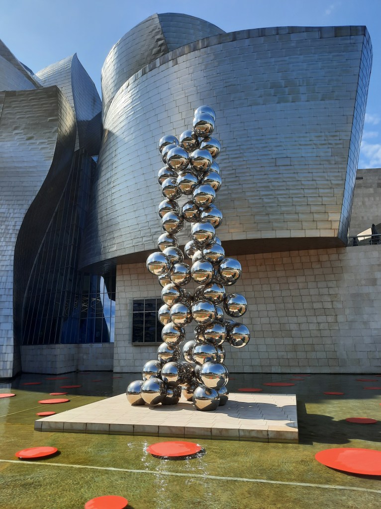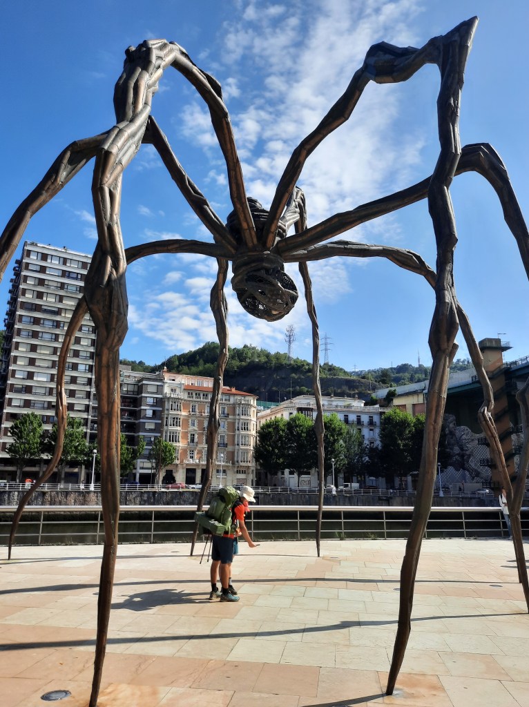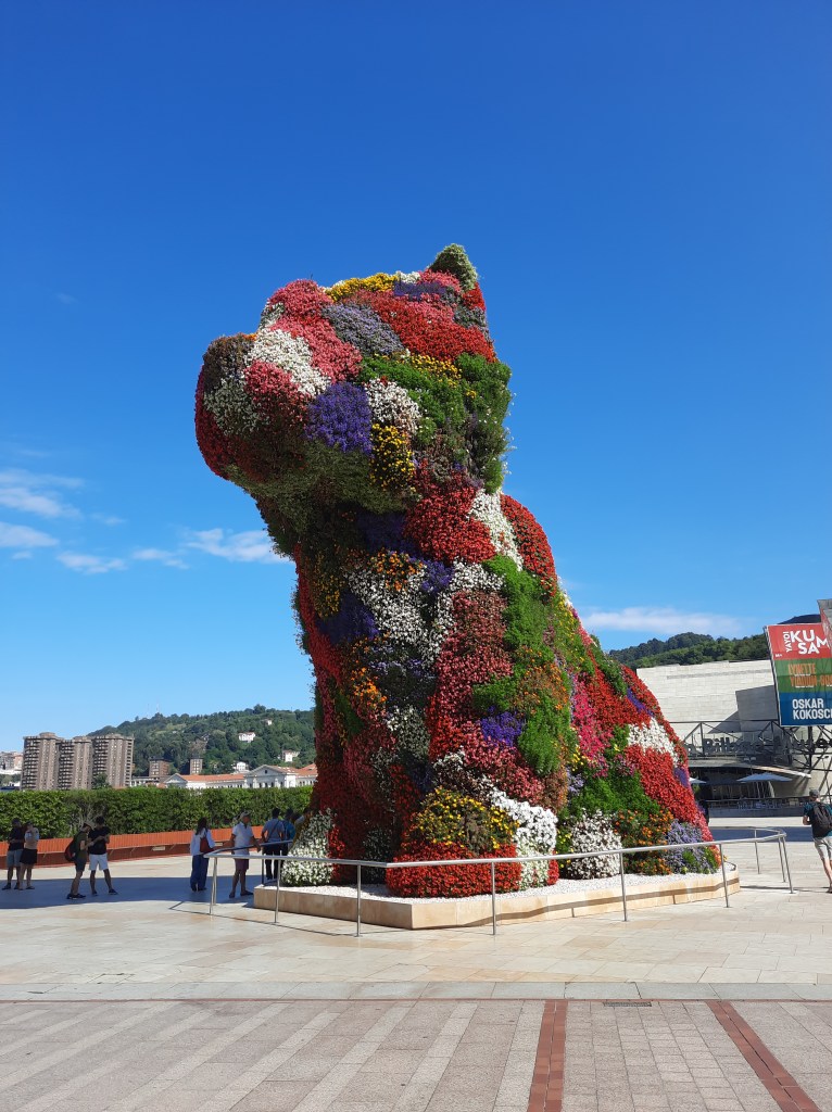 On dort sur un parking. Samedi, on visite Bilbao avec +34°C au compteur ! C’est une très jolie ville mais pas assez fleurie à mon goût. Le musée Guggenheim a une structure particulière. Devant le musée, vous ne pouvez pas le louper : Puppy, la plus grande sculpture florale du monde. Et de l’autre côté se trouve Mommy, une sculpture d’araignée de près de 9m de haut !