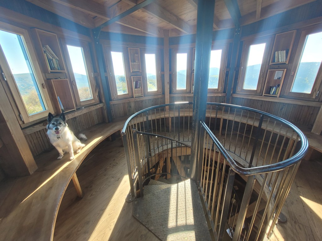 L’intérieur est moins abîmé que l’extérieur mais les livres présents sont là depuis bien des années. Ils ont pris l’humidité et la poussière. Le plateau d’observation à 360° nous offre une vue sur le paysage. Si cet endroit était entretenu, ça serait une tout autre ambiance.