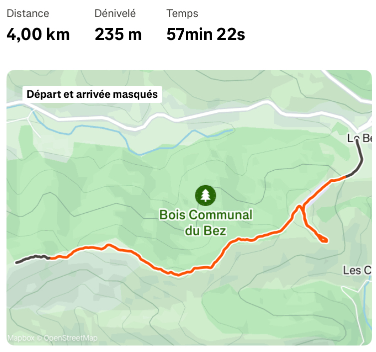 Je me gare à l’Auberge du Bez et me dirige vers les panneaux explicatifs. Après avoir pris en photo le plan, mis une bouteille d’eau et une barre de céréales dans mon sac à dos, pris la laisse de Nini, je commence la randonnée.